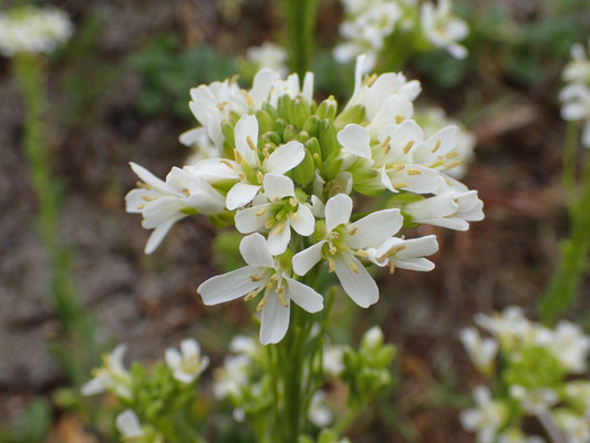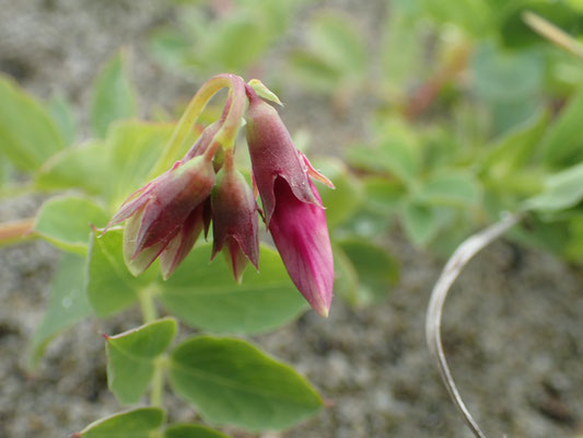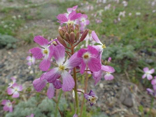 最初に目に入ったのはハマハタザオの群落でした。そしょてまるで張り合っているかのようにハマダイコンも咲き誇っていました。目的のセナミスミレもあちらこちらにきれいに咲いていて、参加されたみなさん興奮して写真に収めていました。また近くにはハマエンドウも咲き始めていました。